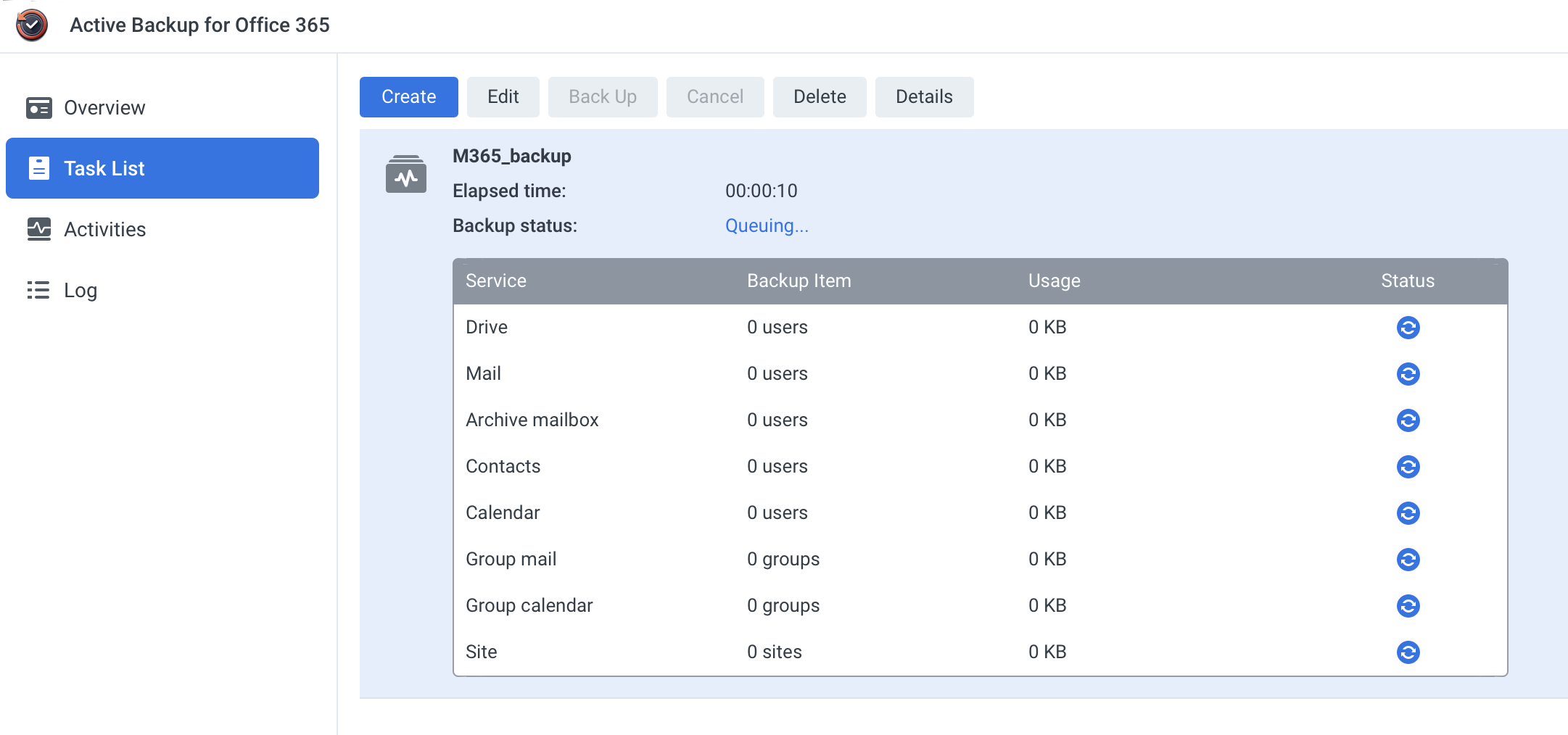 Once you start using the O365 space, Active Backup will begin backing up immediately (depending on the settings configured before) and you will see the results on your Synology NAS.