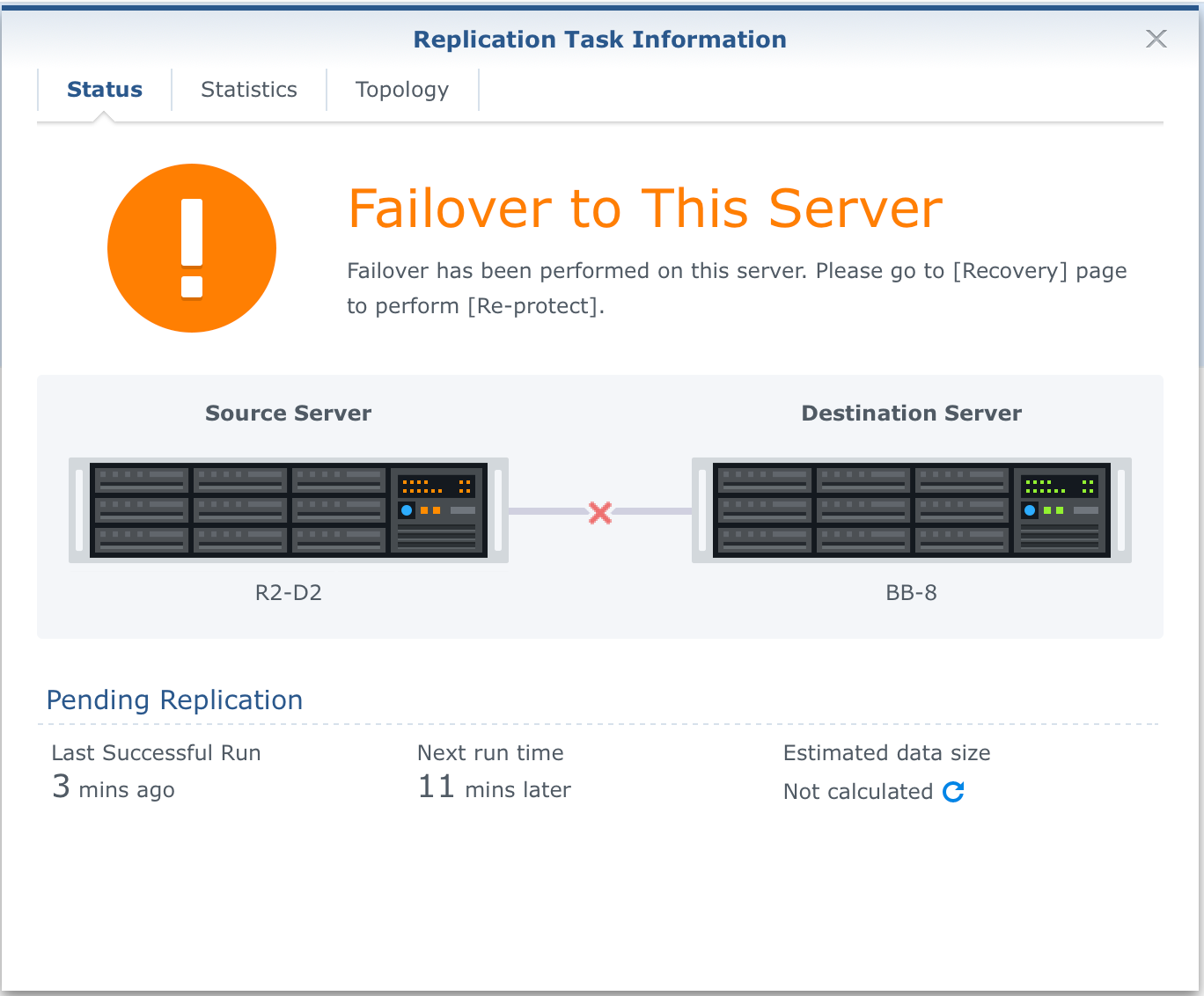 Despite the image above, failover is complete and successful. You simply need to re-protect your new destination (NAS2) to make it a new main replication point.