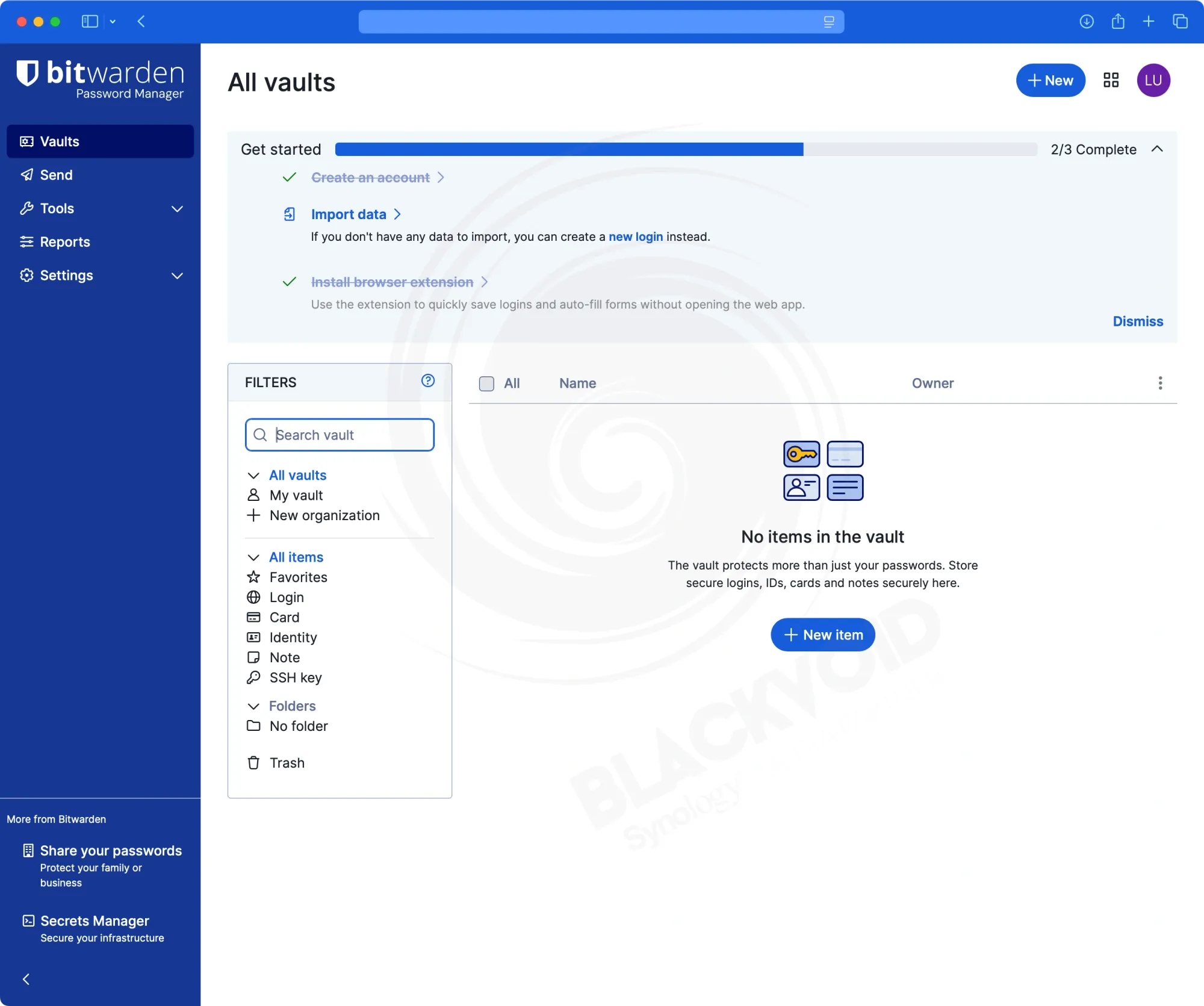 Following this, we are presented with an identical cloud interface that Bitwarden offers to its customers. Additionally, a new "task" list appears, outlining the steps needed to complete the setup. From this point onward, you can either add new items or import existing ones if you already have a running instance or are using the cloud-based Bitwarden version.