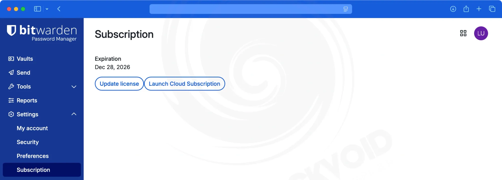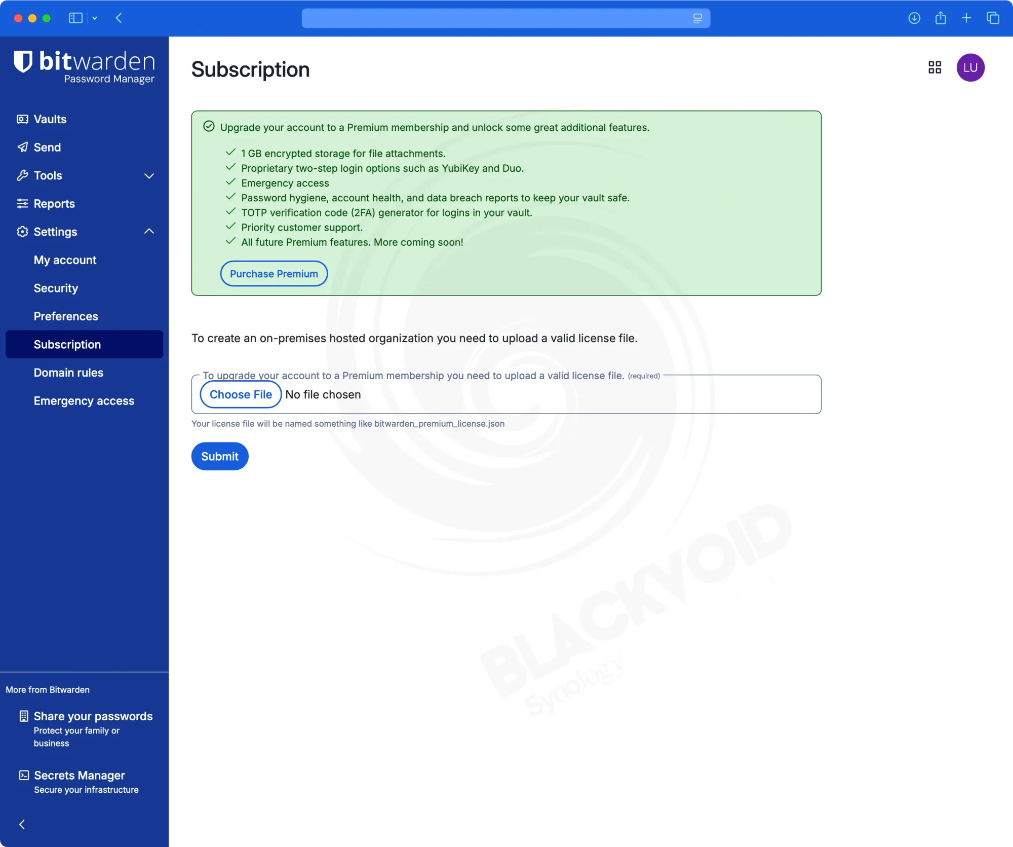 Self-hosting the official Lite version of Bitwarden requires an active subscription with bitwarden.com to unlock premium features locally. Exporting the license from the official website will generate a .json file, which can then be imported using the subscription menu option.