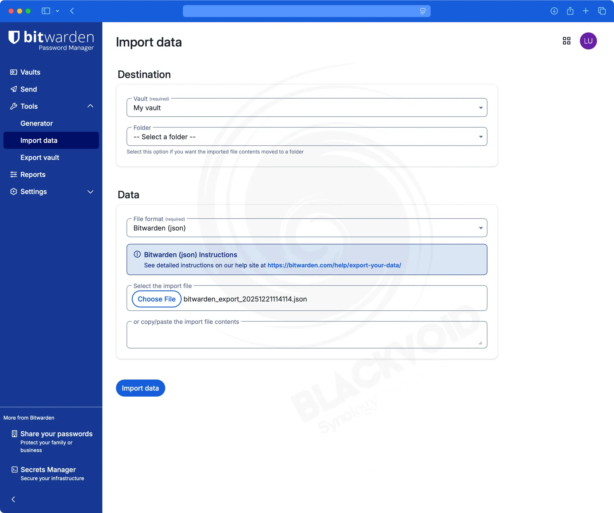 The import/export section is located within the Tools menu, as always. As previously mentioned, exporting and importing data from compatible Bitwarden instances—including VaultWarden—works seamlessly, allowing for a 100% compatible migration that completes within seconds.