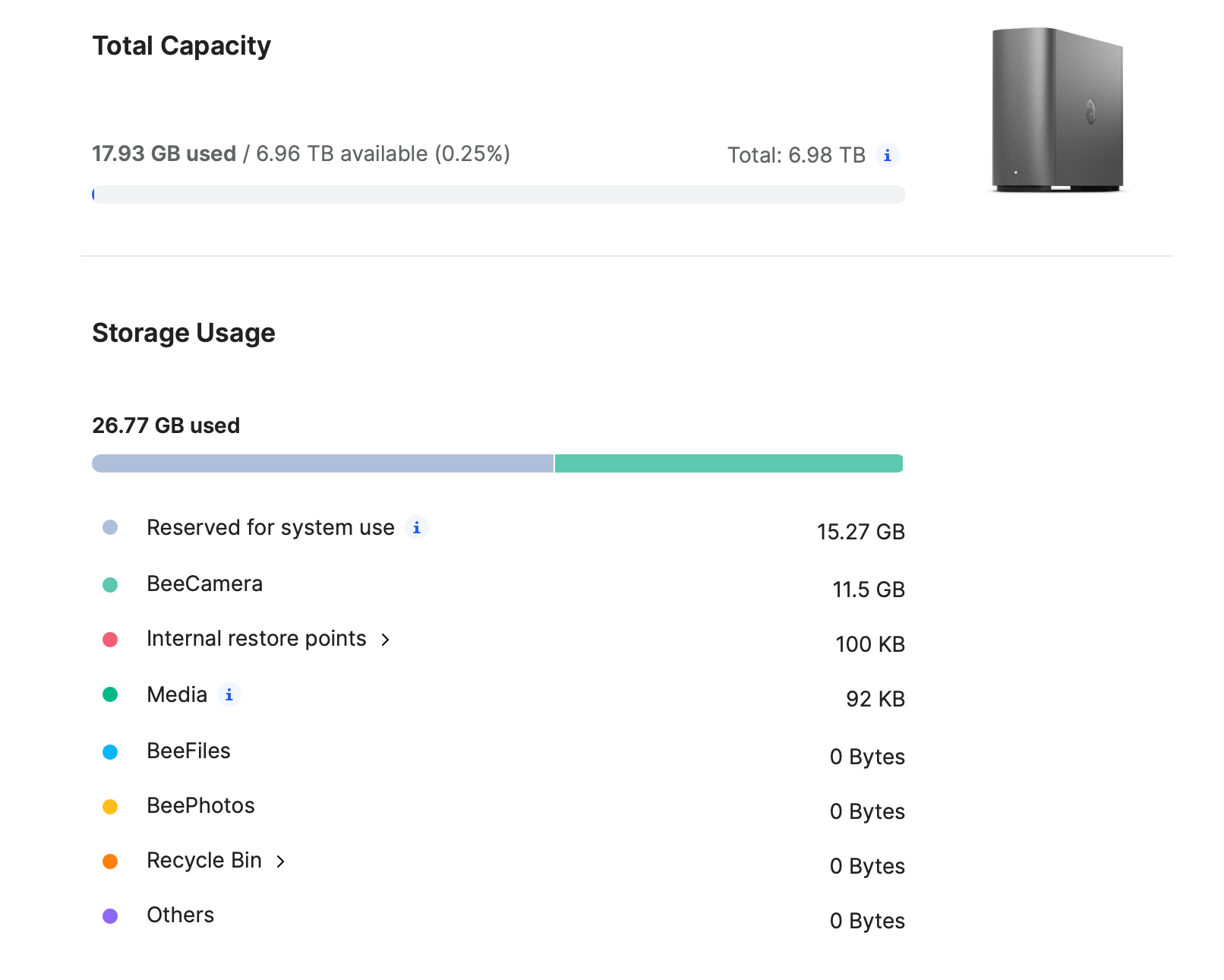 With the default 30-day retention setting, continuous 24/7 recording would require approximately 1 to 1.5 TB of storage. Considering the BeeStation model has 7 TB of usable space, allocating around 20% per month for all-day surveillance leaves ample room for ongoing recording without immediate storage concerns.