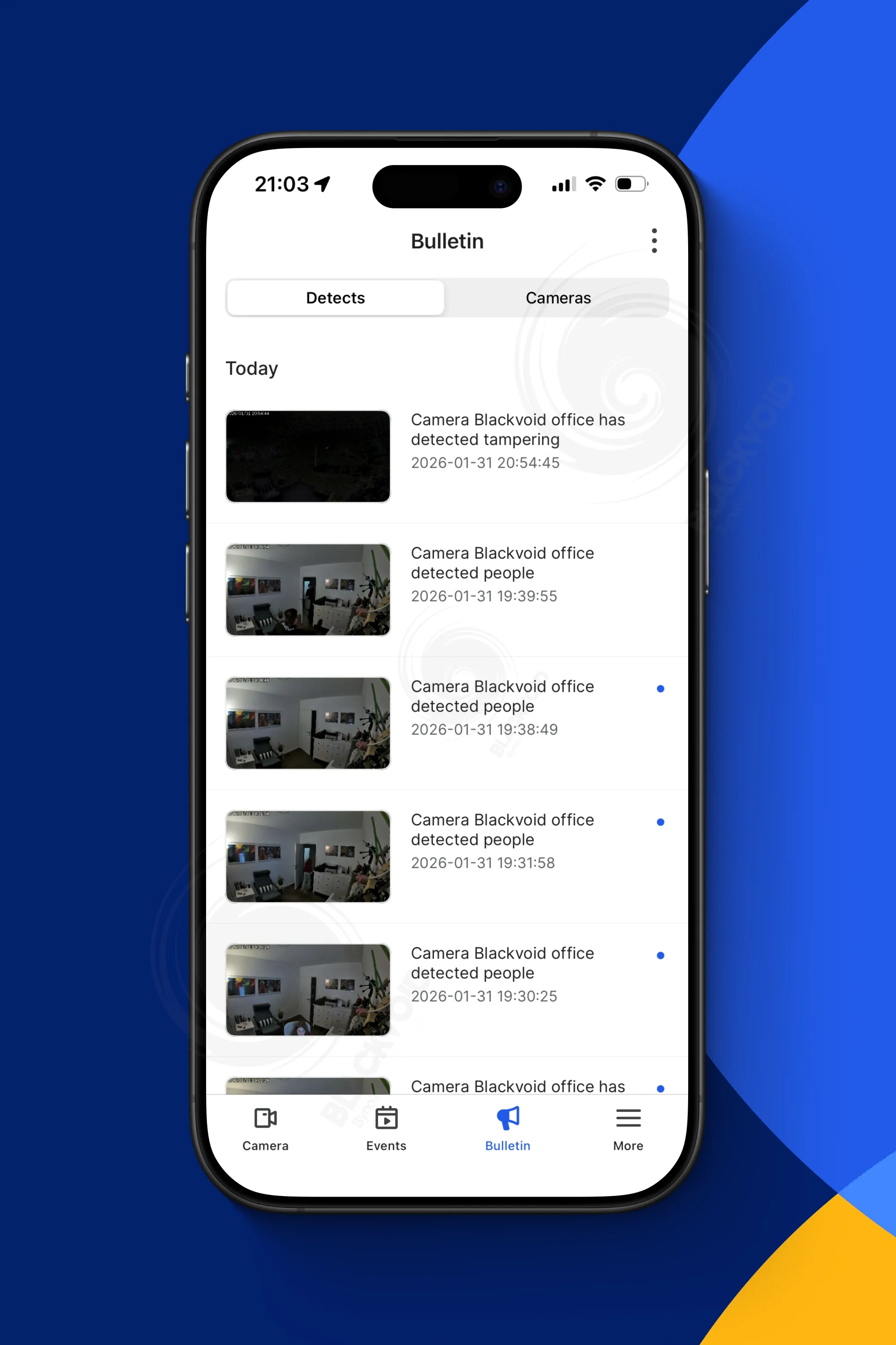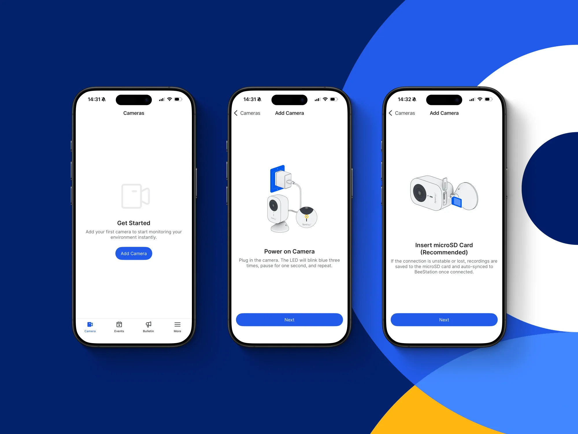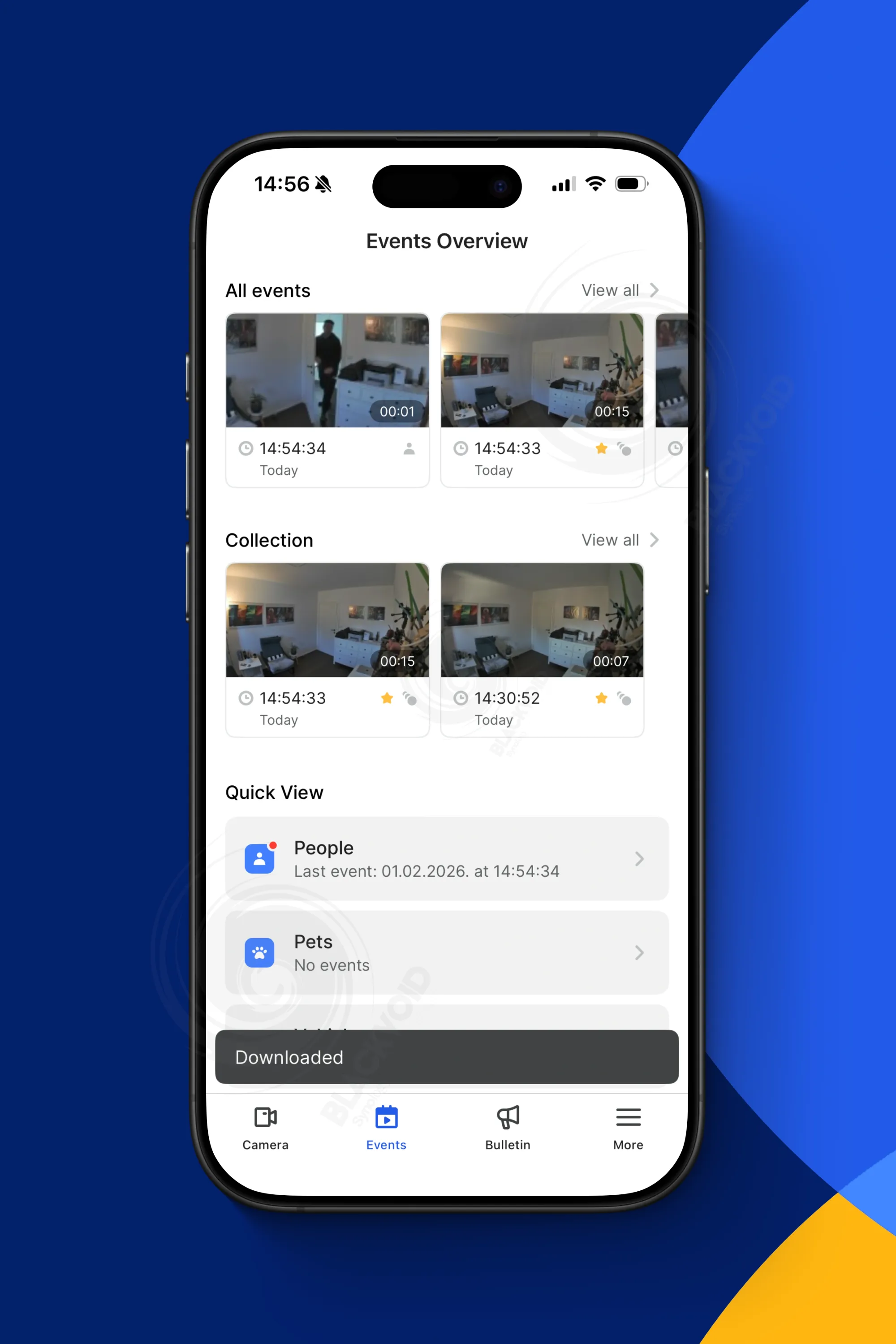 Beyond the core Surveillance Station features, the BeeCamera app presents expected functionalities with its own distinct interface. In addition to the camera tab, the app includes Events and Bulletin tabs, which provide a quick overview of motion or trigger events, notifications, and time-based shortcuts. These features enable users to swiftly review or download footage directly to their mobile devices.