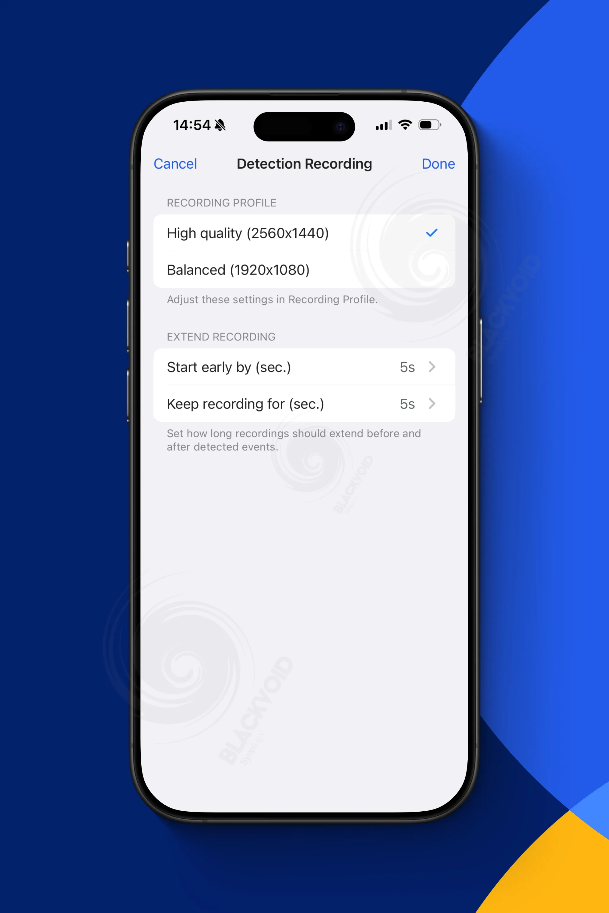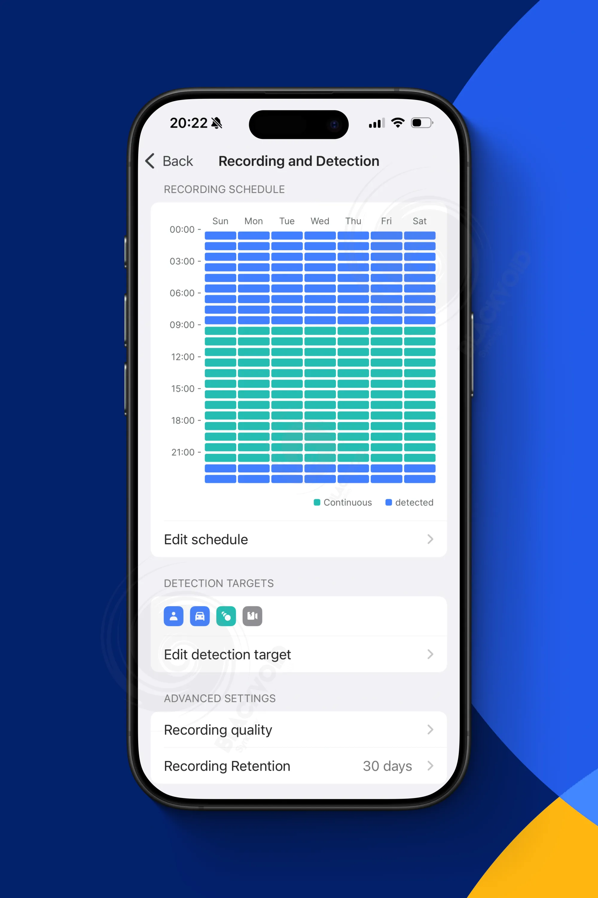 Recording and detection settings offering a detailed schedule, detection targets, zone definition, and recording quality and retention