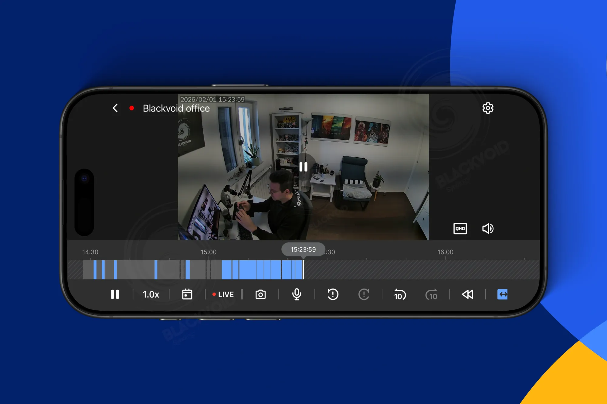 The app supports both landscape and portrait modes, including a multi-view option, providing all essential settings within easy reach. Just below the video image, there is a familiar color-coded timeline with various controls, such as play/pause, two-way audio, event trigger shortcuts, and more.
