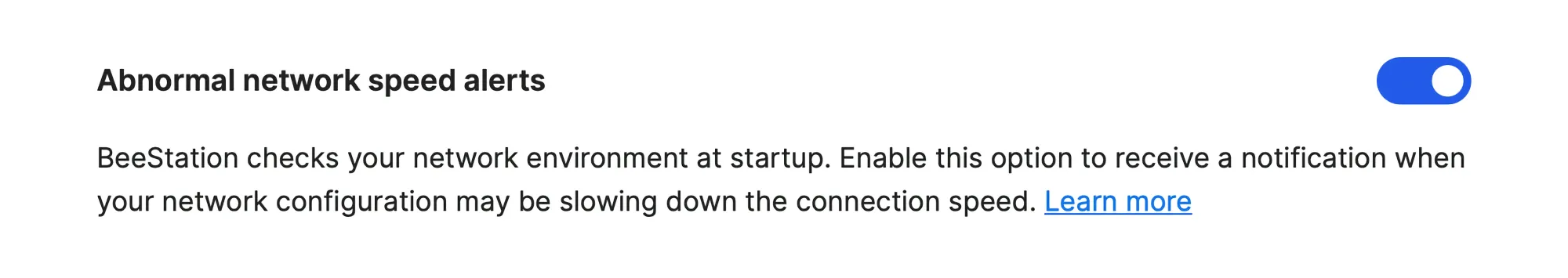 - Added abnormal network speed alerts: BeeStation now notifies you of unusual network conditions to help identify connectivity or configuration issues.