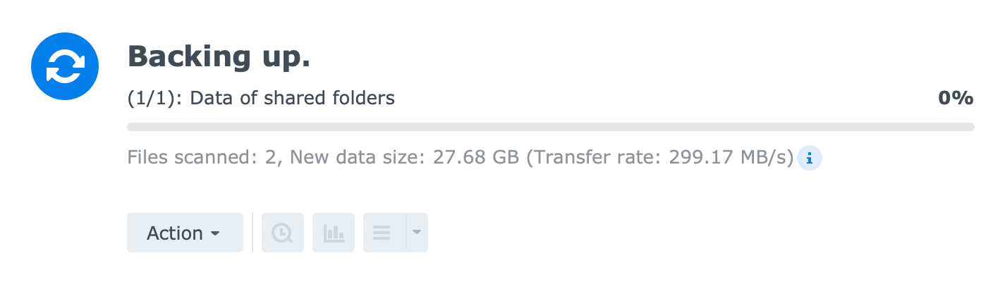 Again, the speed of the backup in the Synology world will depend on the tools as well as the data type being backed up. The average backup speed of this particular task was 30MB/s give or take and it took 30 min to create an initial 57 GB backup over 1GbE network interface.