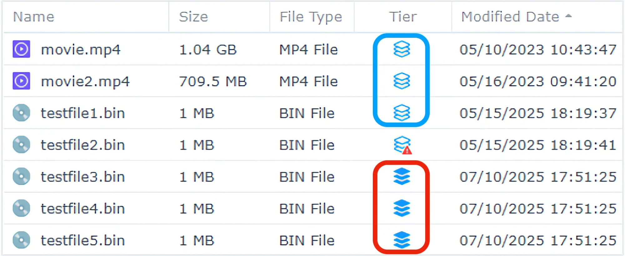 Enabling tiering on the hot tier does not change the original shared folder permissions for admins or users. NAS admins can see in which tier a file is located through File Station from the hot tier. They can also access files stored on the cold tier via the cold tier NAS. This provides a sort of a safety net in case the hot-tier NAS fails, data on the cold tier remains accessible.