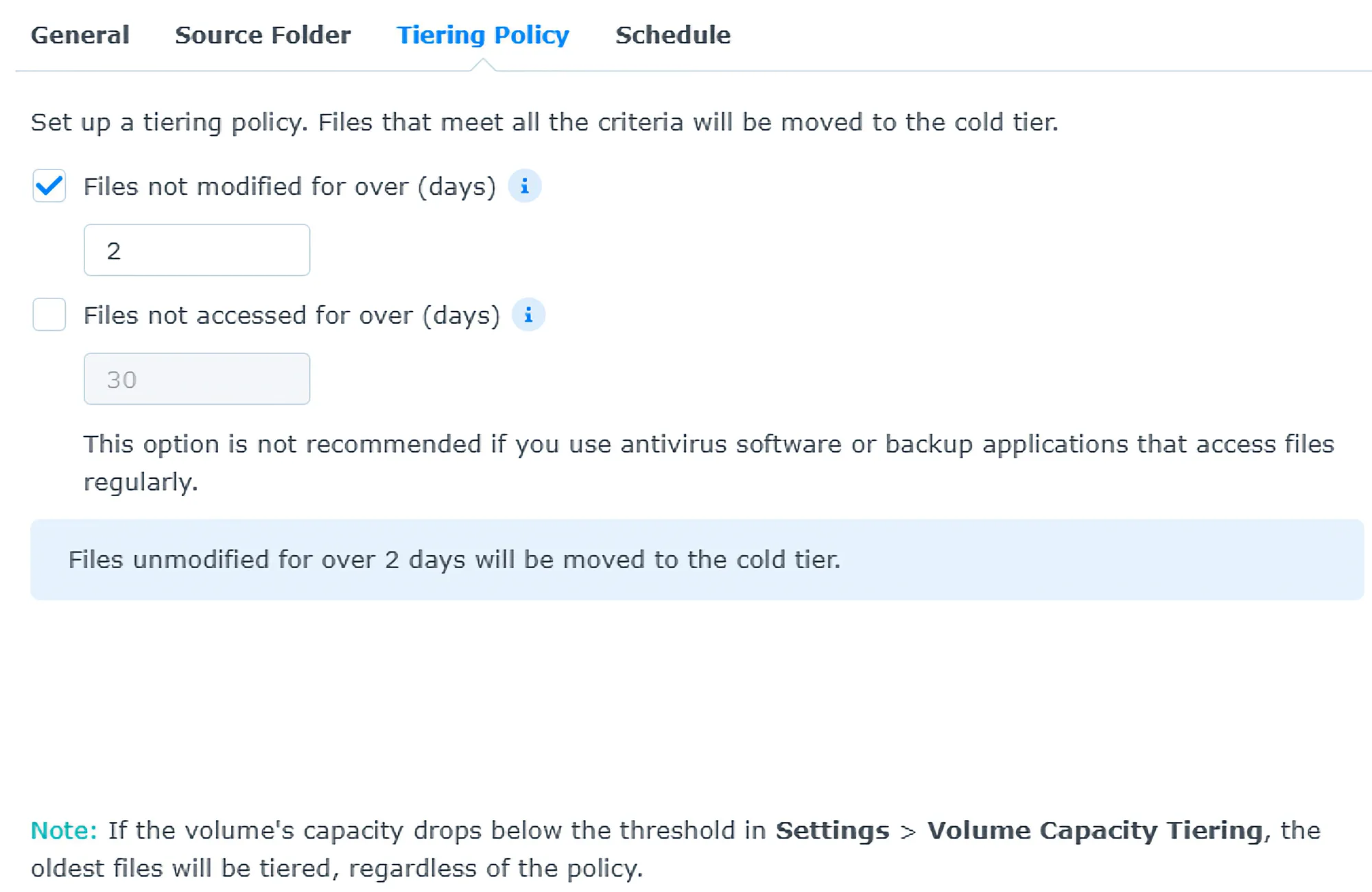 On top of this, the files that will be actually moved can be configured from a minimum of 1 hour up to 1 week. While the tiering plans are configured on a shared folder level, the data tiering occurs on each file in said folder.