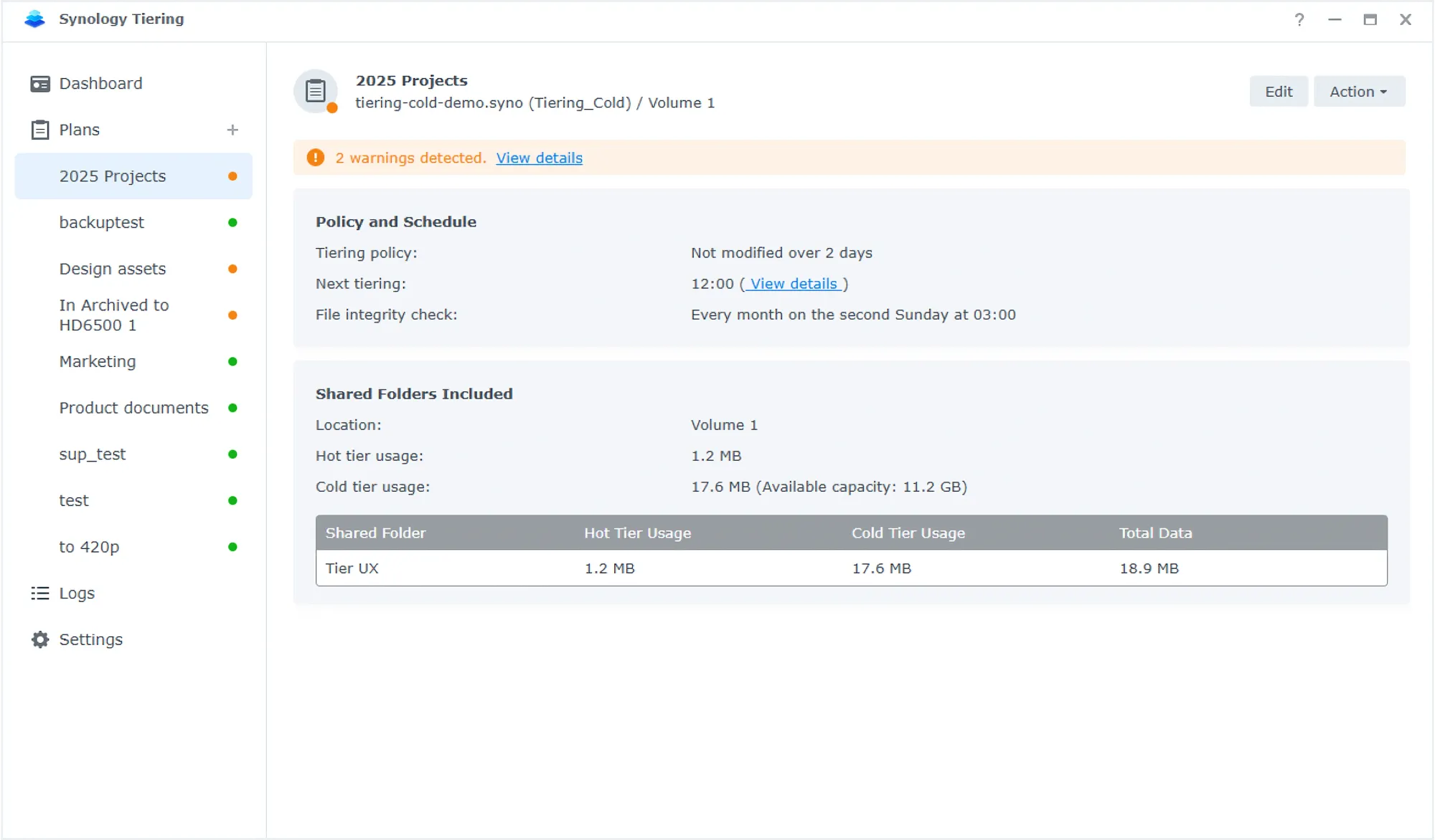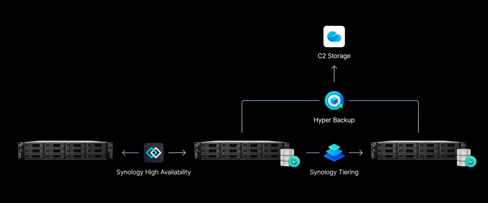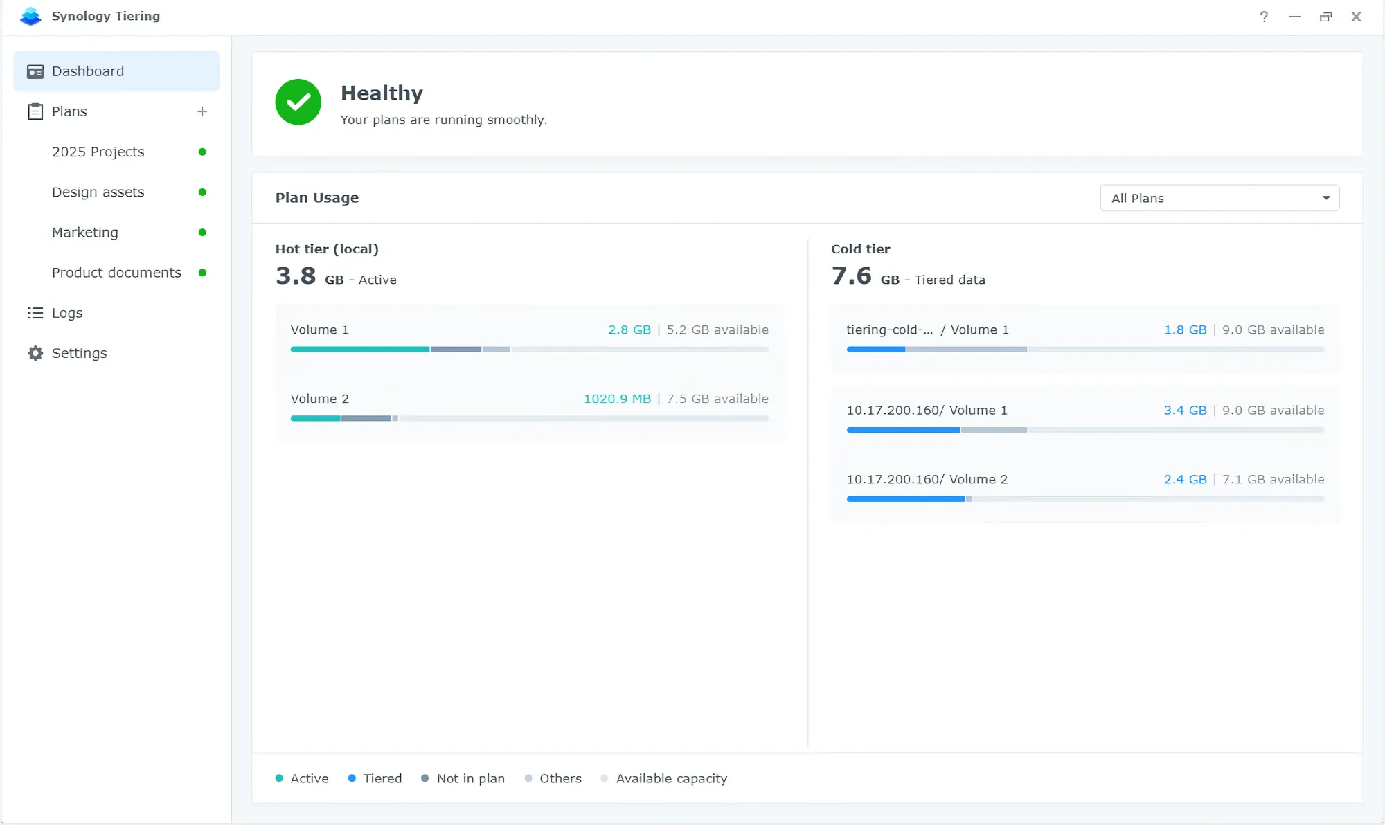 Synology Tiering will move infrequently-accessed files from the hot tier to a cost-effective cold tier, freeing up high-performance resources for critical workloads.
