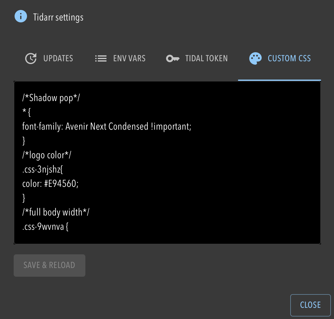 Tidarr offers a simple and elegant CSS customization window with a save and reload button, allowing for immediate changes without the need for a full app restart or container restart. While not glamorous, this feature is highly practical for quick and instant customization.
